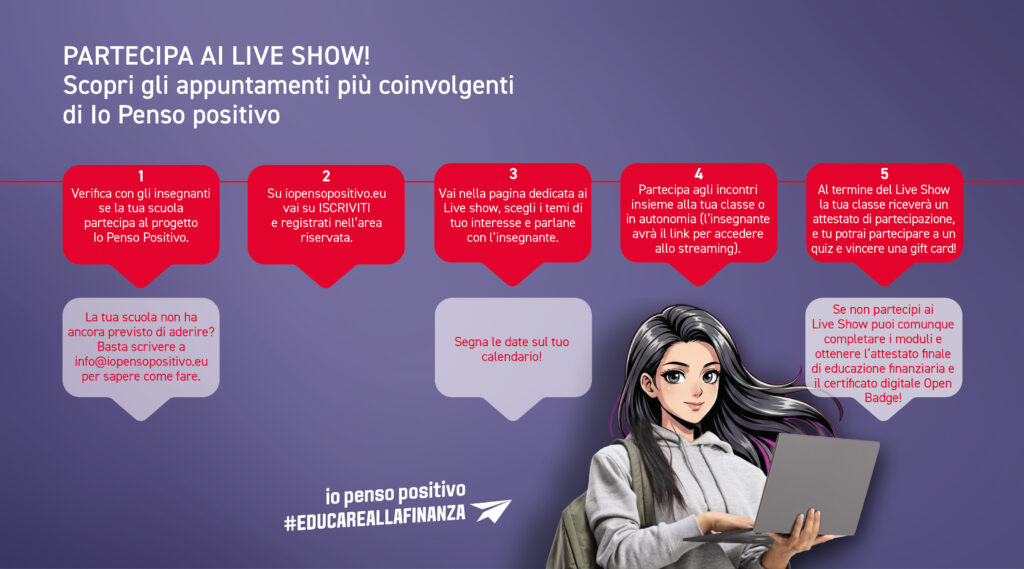 Io Penso Positivo prevede l’organizzazione di 10 Live Show tra marzo e maggio e di 1 Hackathon, grande novità di questa edizione, previsto per maggio 2026. Durante ogni Live Show, alunne ed alunni potranno partecipare a uno spazio interattivo di quiz, con premi per i primi tre classificati.