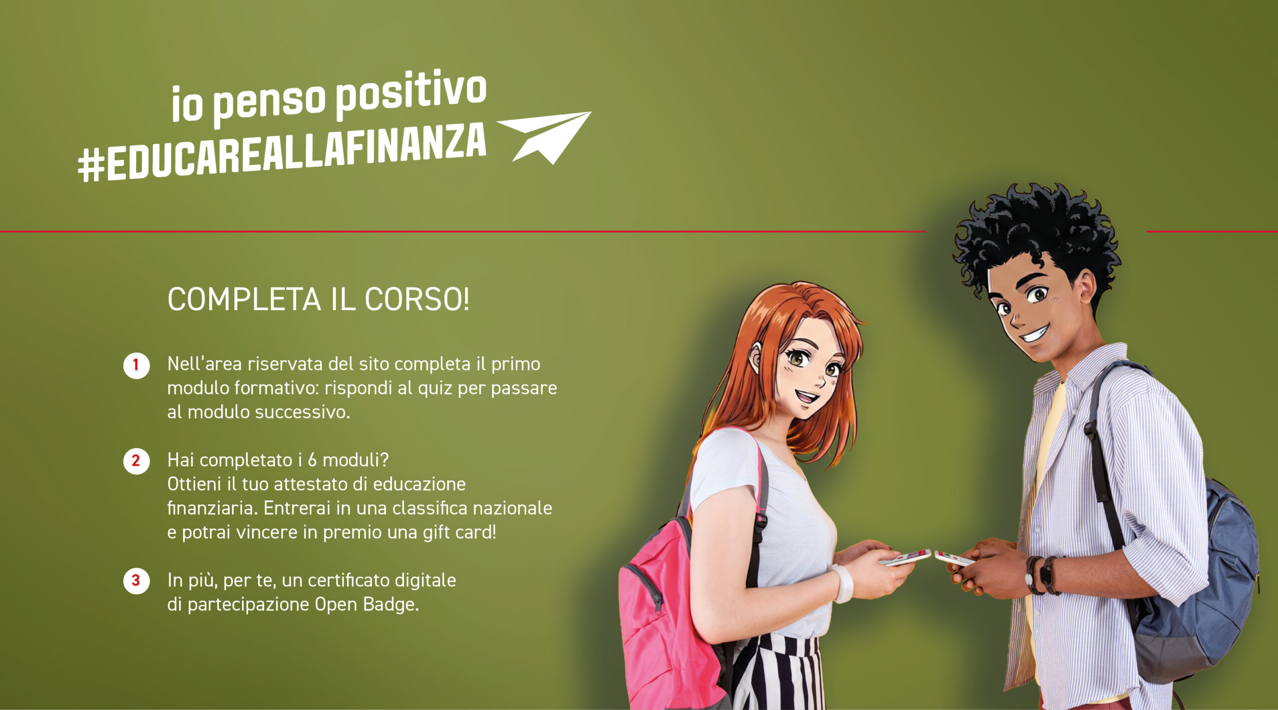 Per ottenere l’attestato di Educazione Finanziaria è necessario superare i 6 moduli presenti in piattaforma. Ogni modulo prevede il superamento di un test sulle competenze acquisite. Inoltre, passando da un modulo all’altro, accumuli punti che ti fanno salire nella classifica nazionale a cui partecipano altre studentesse e studenti (i primi 30 ricevono un premio!)