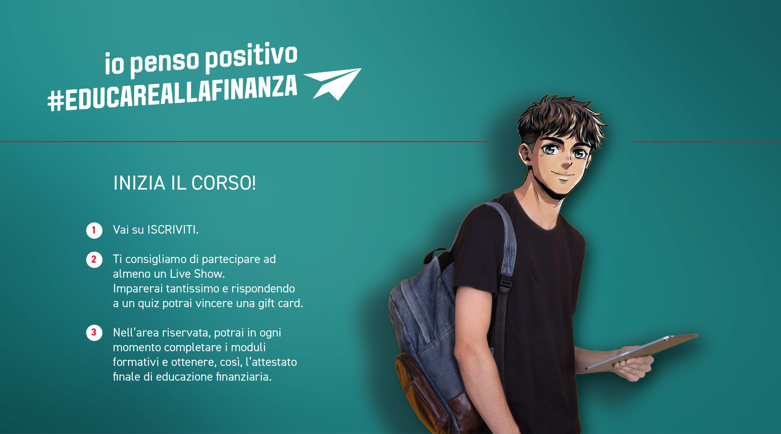 Se sei una studentessa o uno studente e vuoi mettere alla prova le tue competenze in educazione finanziaria, questa è l’occasione che fa per te! Vai su ISCRIVITI, compila il modulo e preparati a iniziare un percorso formativo che ti renderà più consapevole nelle tue decisioni finanziarie, aiutandoti a fare sempre le scelte giuste.